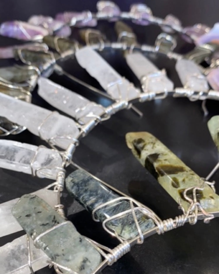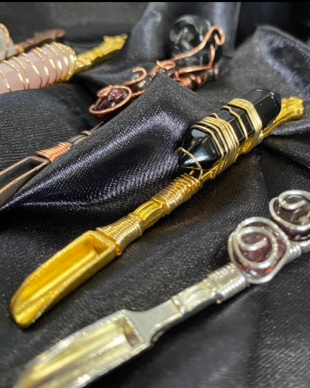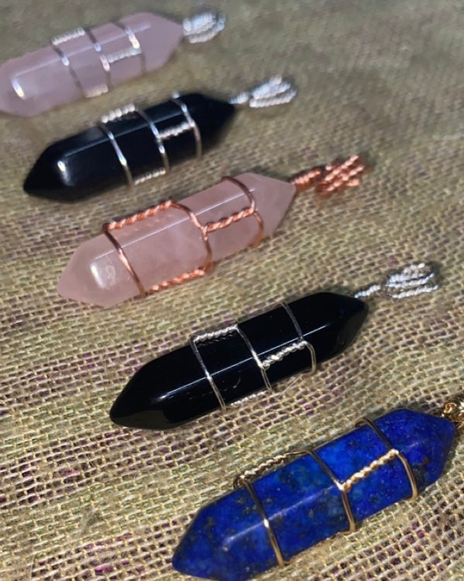 Agate slices featuring double pentacles to showcase the aspects of balance. Natural & dyed agate; wrapped in pure copper but can be recreated in any metals by request.