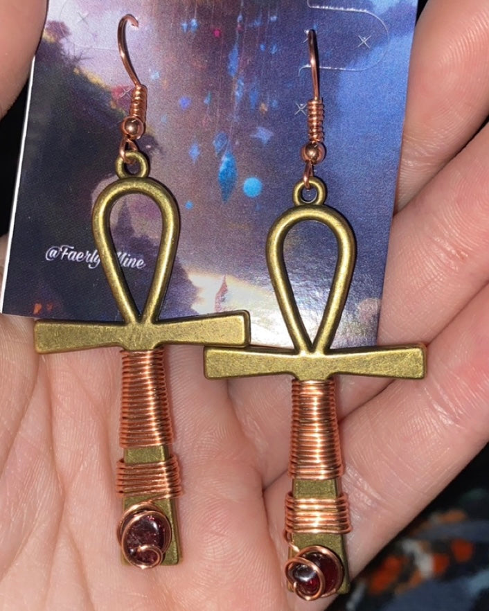 A gorgeous set of ankhs hand wrapped in pure copper to form a set of earrings. Both tips feature a garnet gemstone enclosed in a spiral of copper.