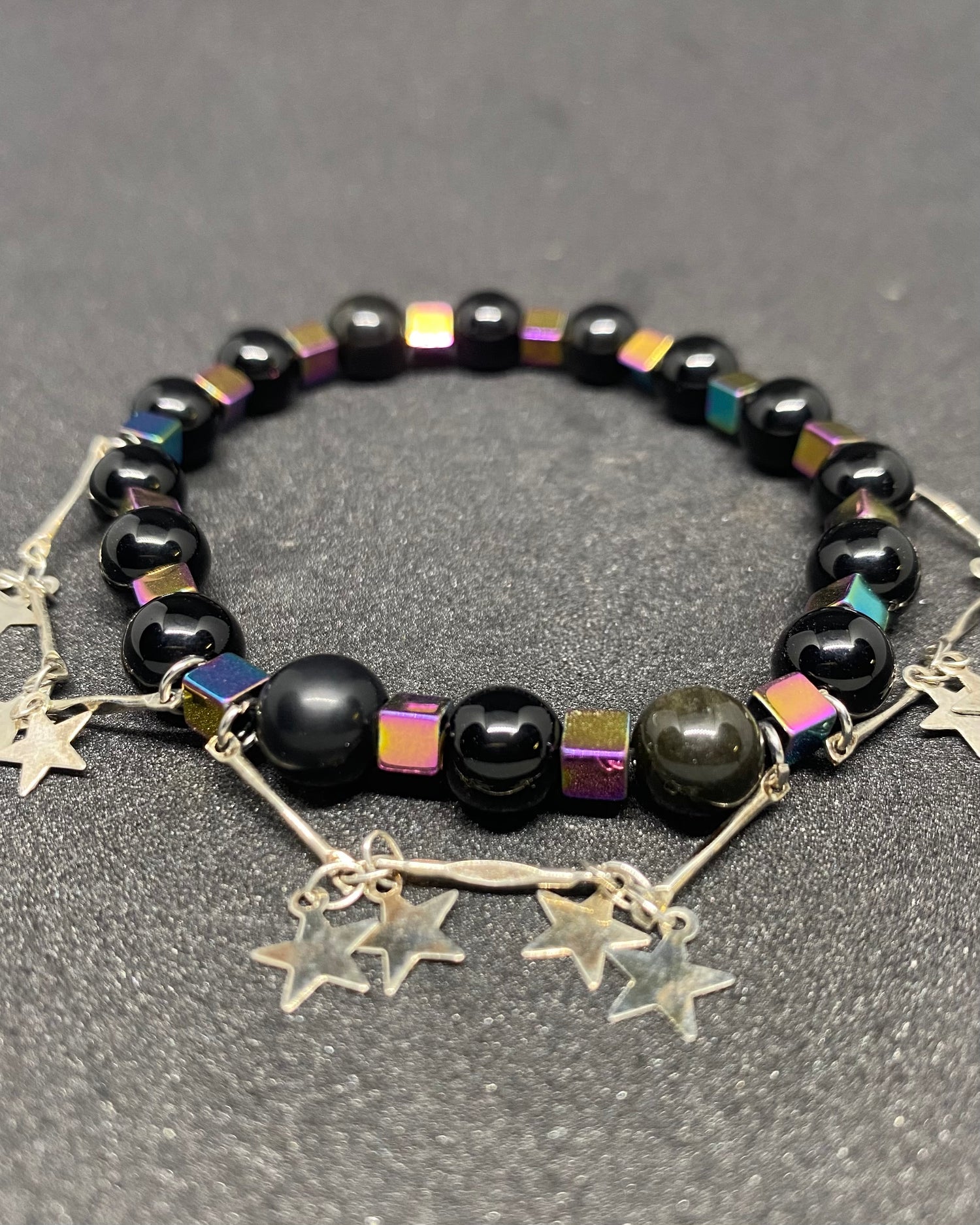 A more unique bracelet design that's truly stellar! Featuring obsidian & rainbow hematite with hanging star charms. The charms have o-ring attachments to give them movement & flexibility for a more comfortable wear.
