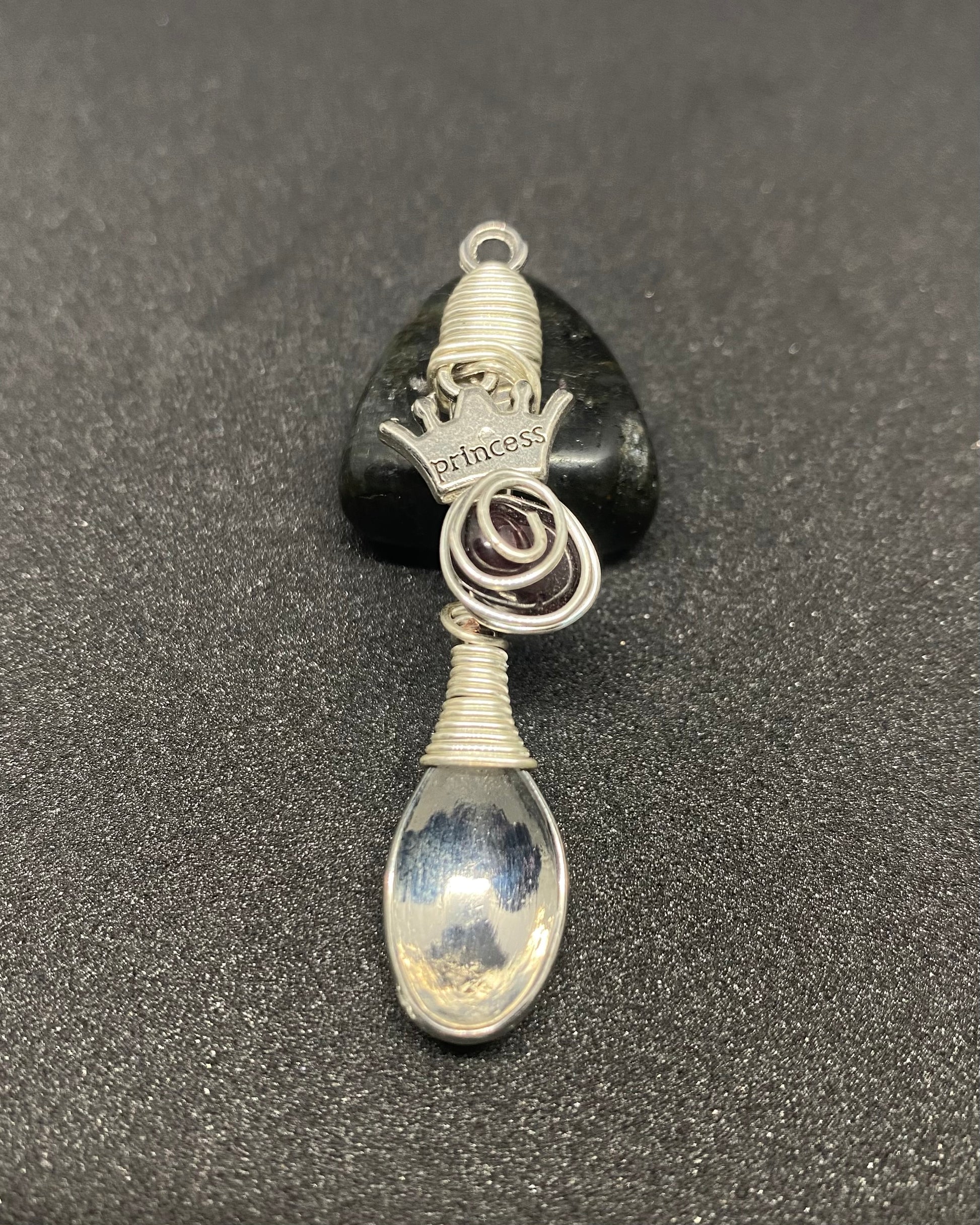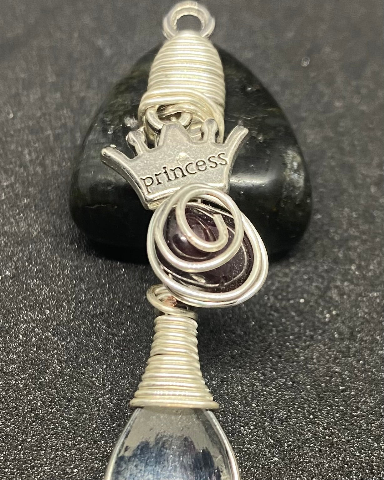 Wrapped with silver jewelers wire featuring a garnet crystal & princess charm