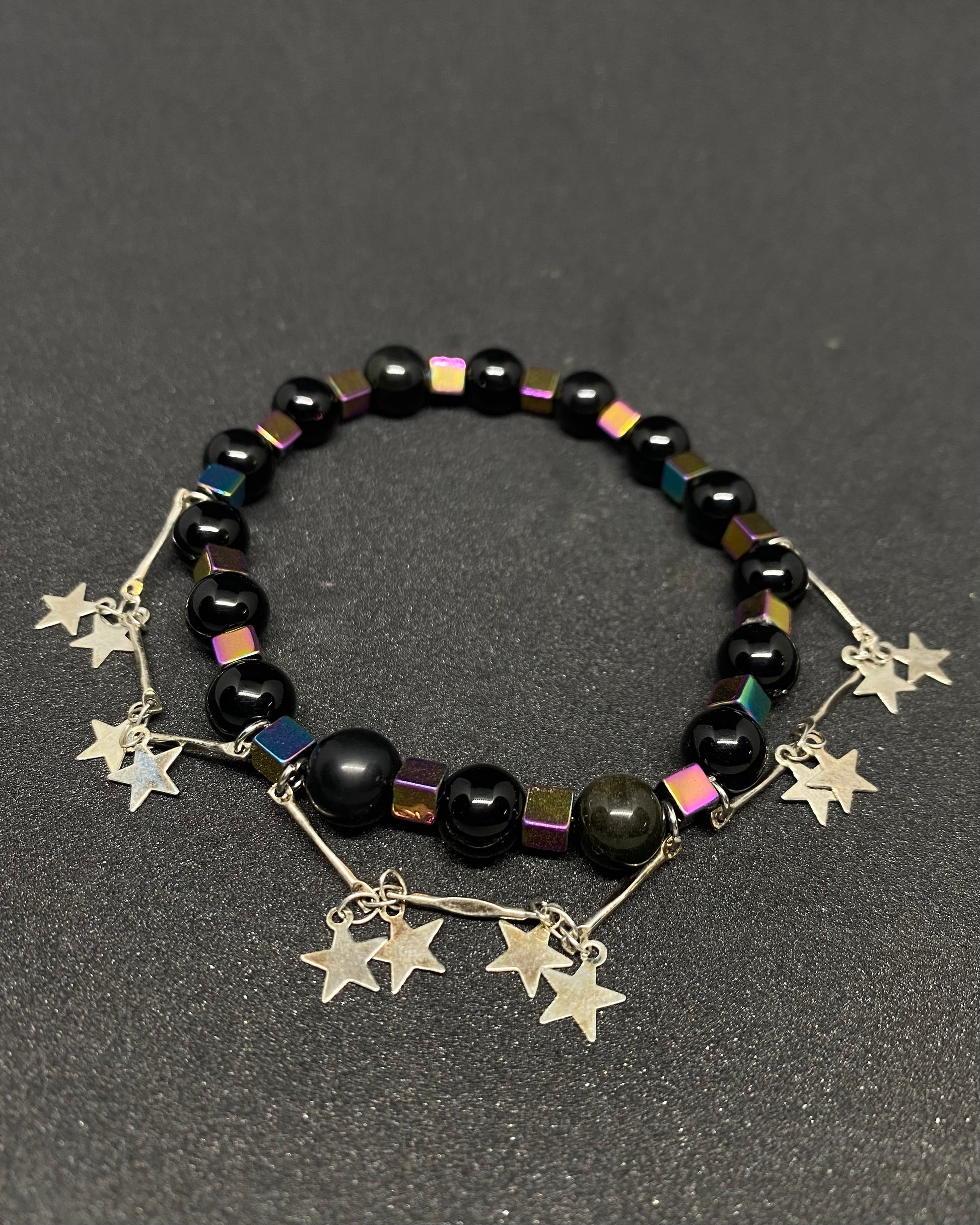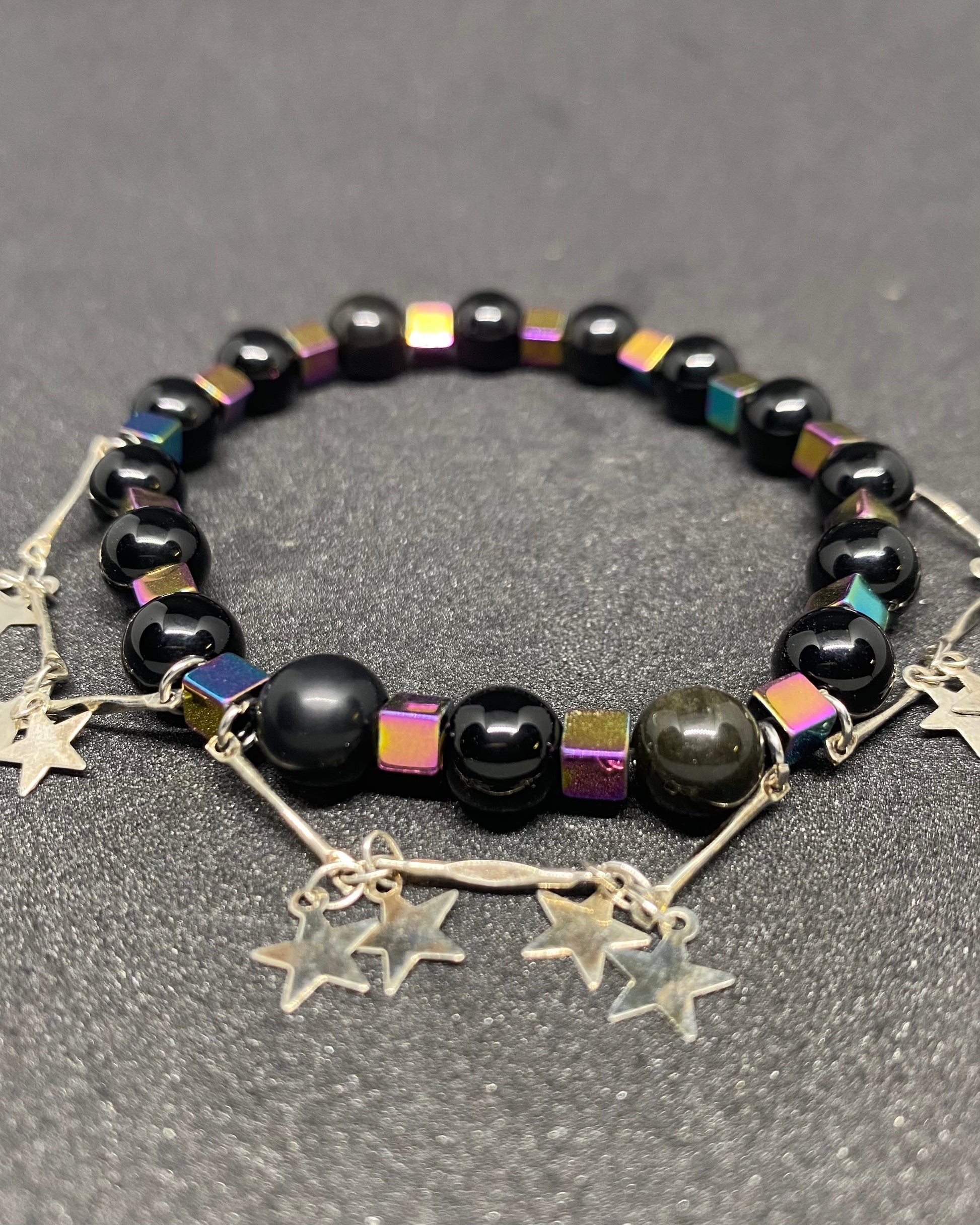 8mm black obsidian beads, 6mm square rainbow hematite beads & jewelers dangly star charms