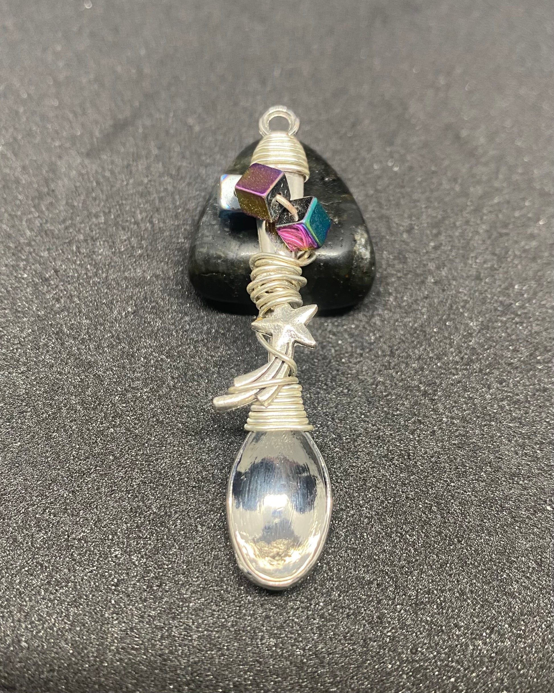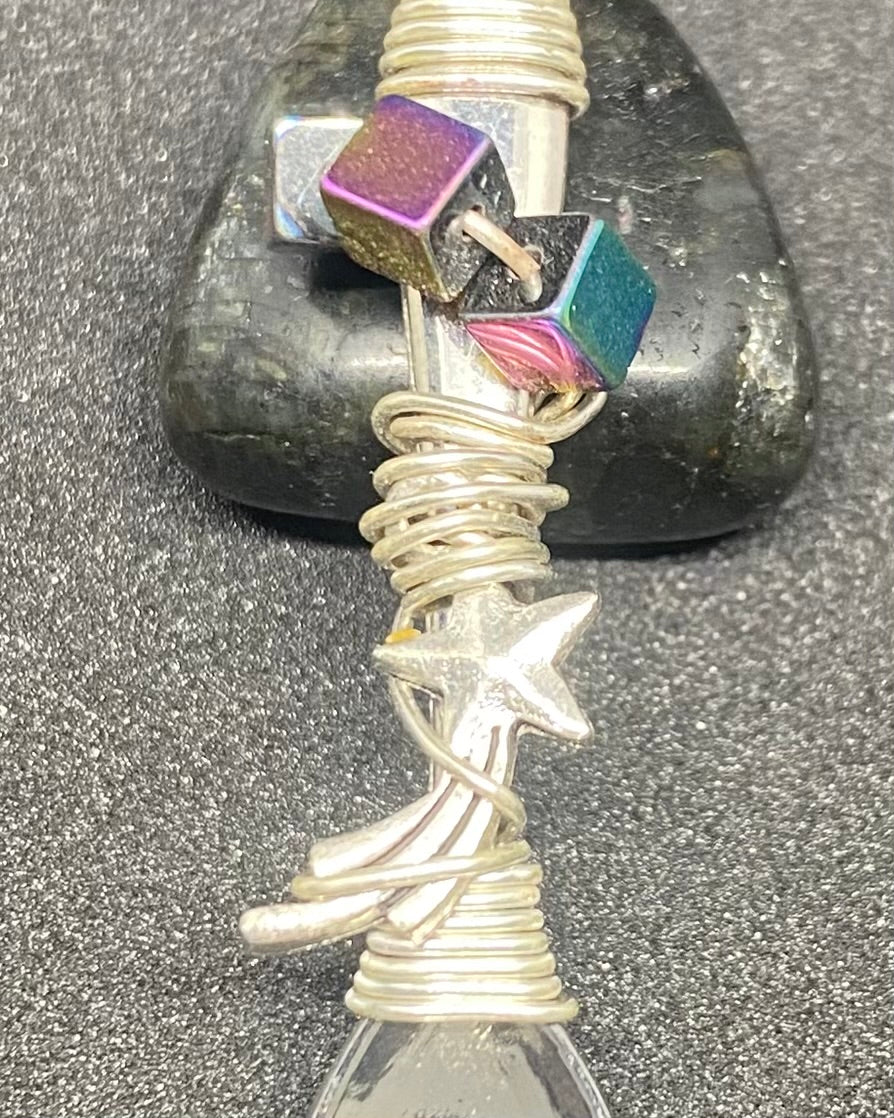 Wrapped in silver jewelers wire featuring mini rainbow hematite & a shooting star charm