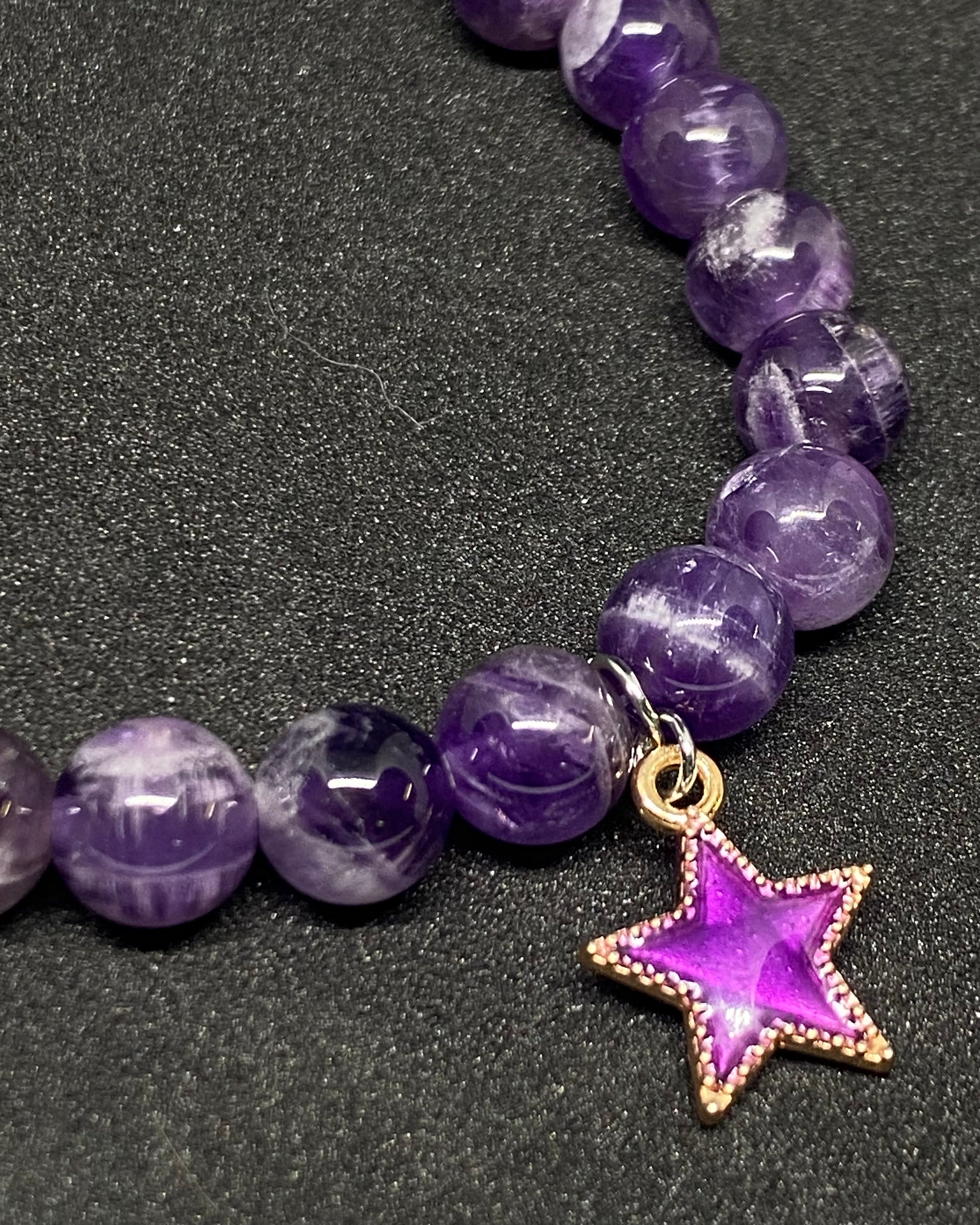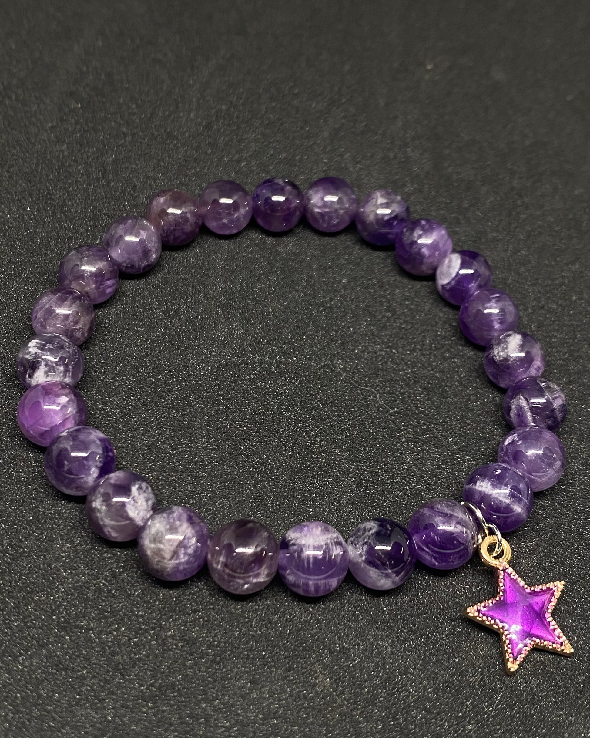 8mm natural gemstone Amethyst beads, this bracelet also features a small purple star charm.