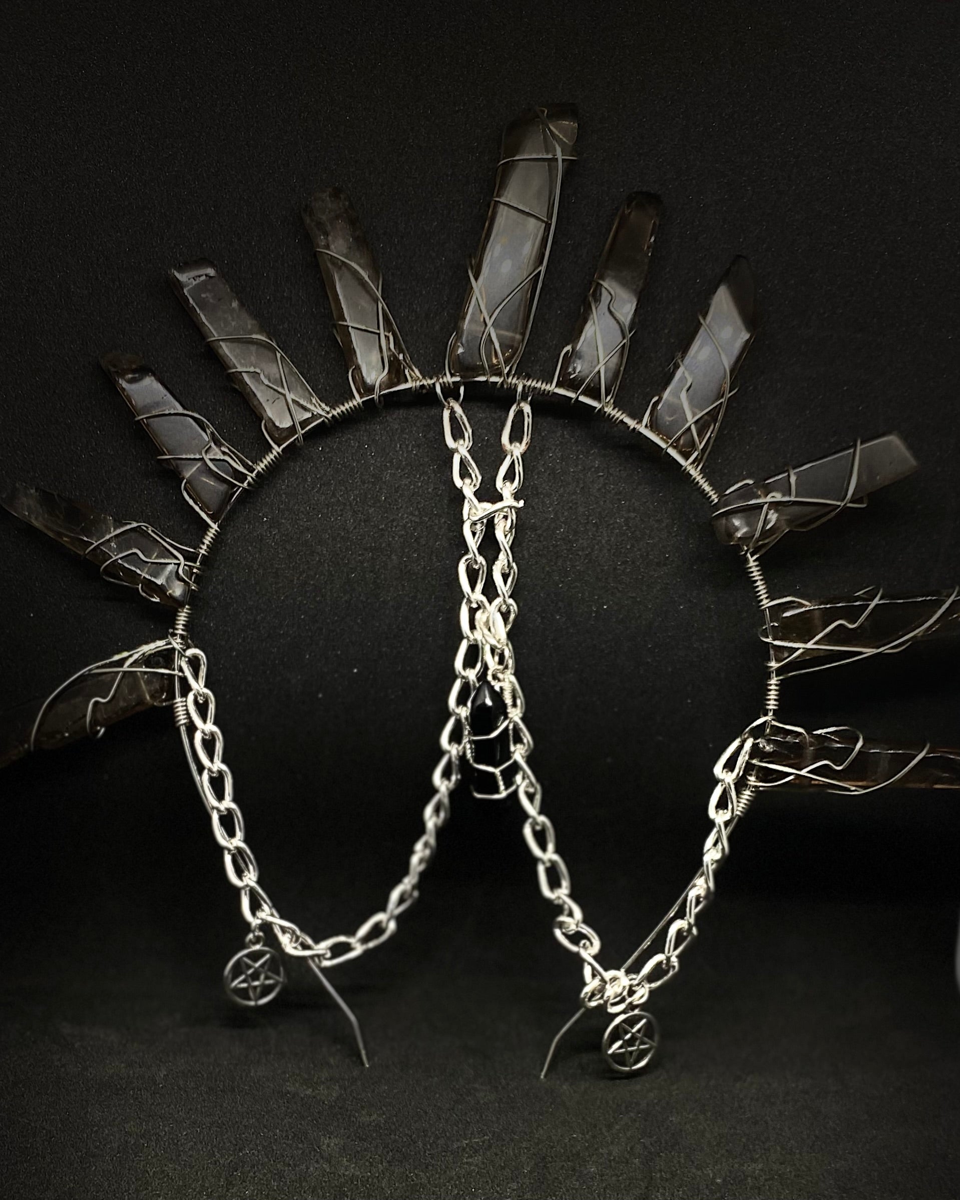 A style fit for any Goddess or Queen, durable & hand made crystal crowns. This piece features a sleek headband with slight bend & is adorned with Smokey Quartz crystals. Extra design elements have been added to create a chained headpiece featuring an obsidian pointed crystal in the center.