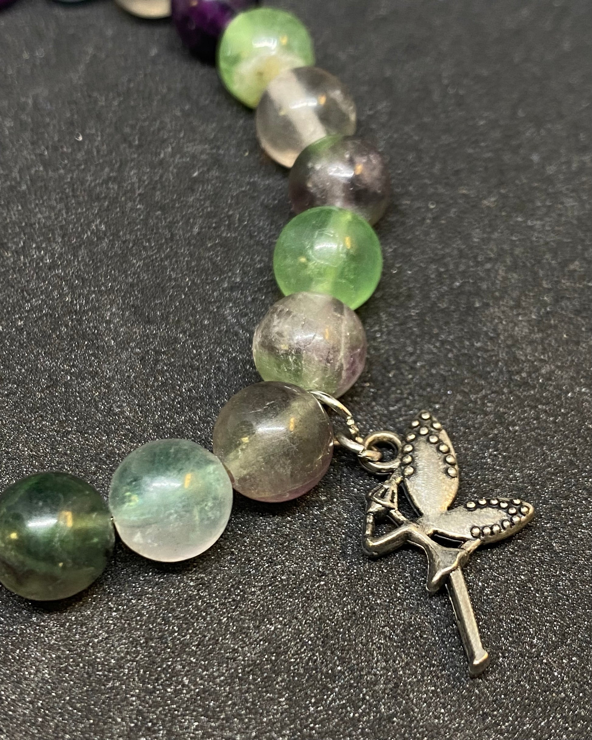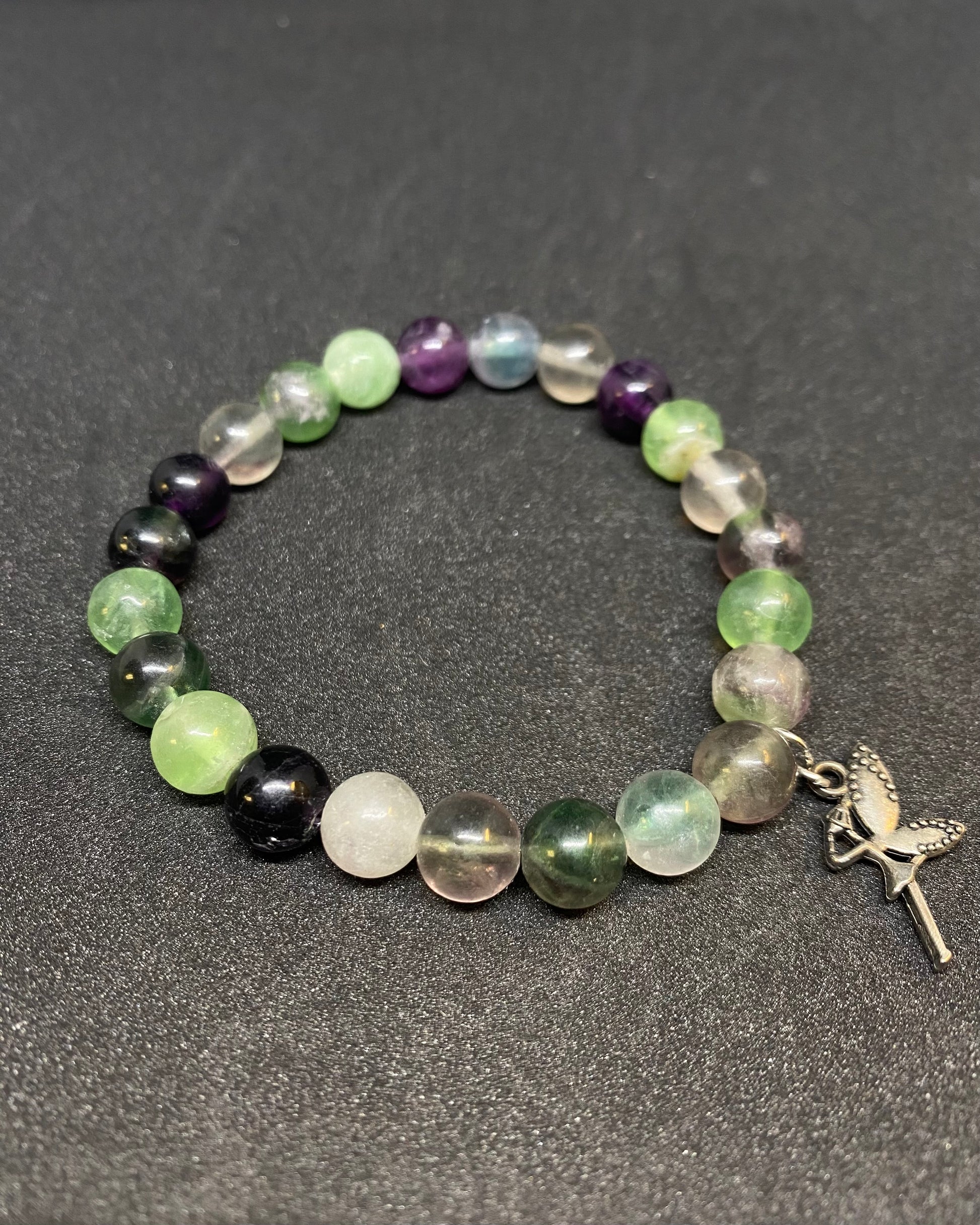 8mm natural gemstone Rainbow Fluorite beads, this bracelet also features a small faery charm.