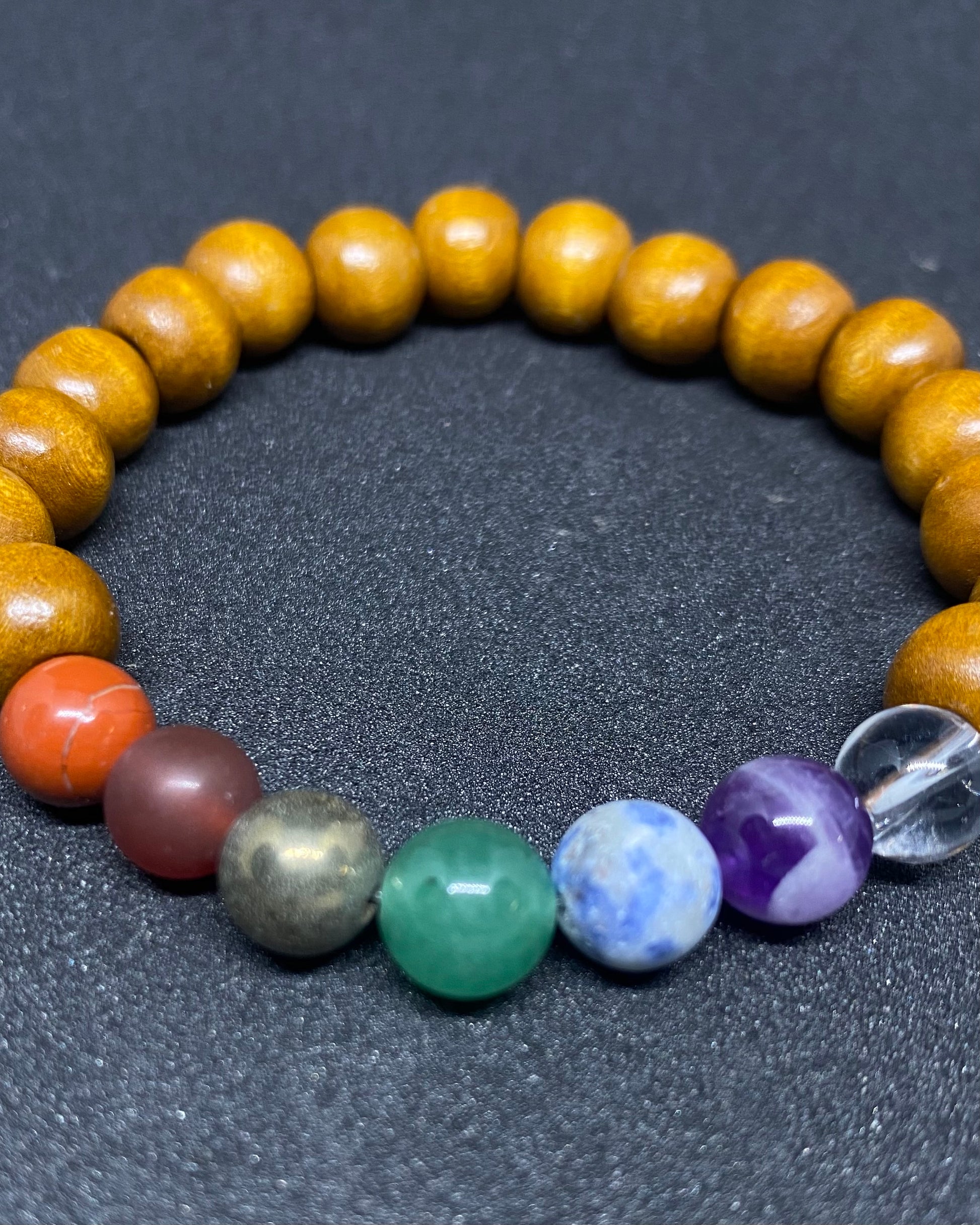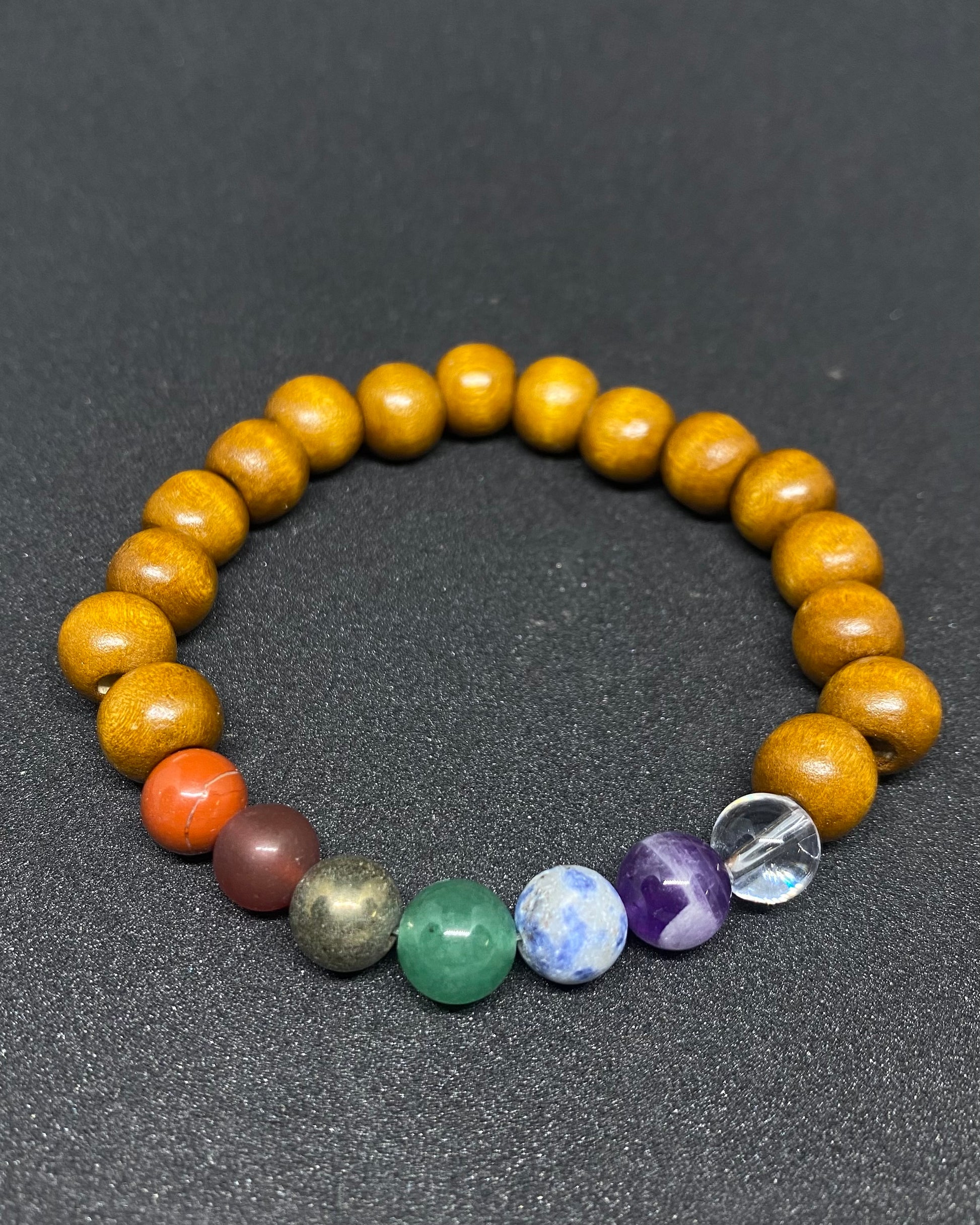 10mm stained pine beads, 8mm Red Jasper, Carnelian, Pyrite, Green Aventurine, Sodalite, Amethyst & Clear Quartz 17cm wrist size