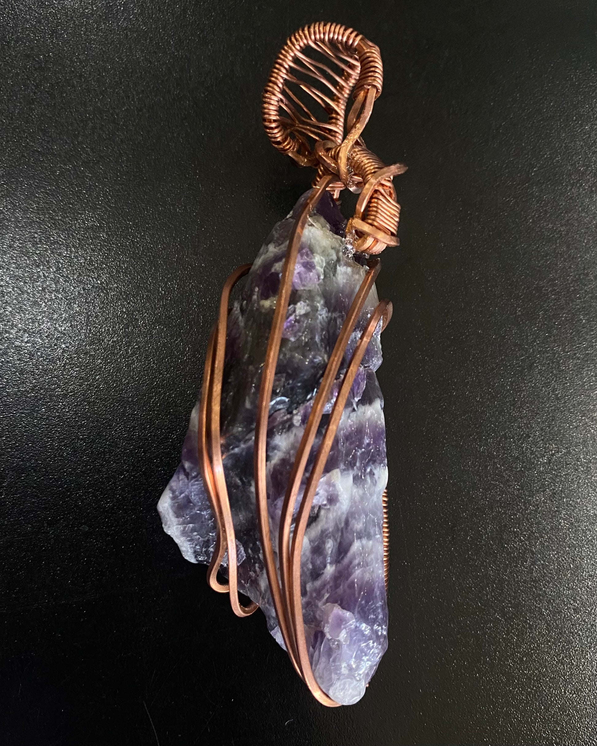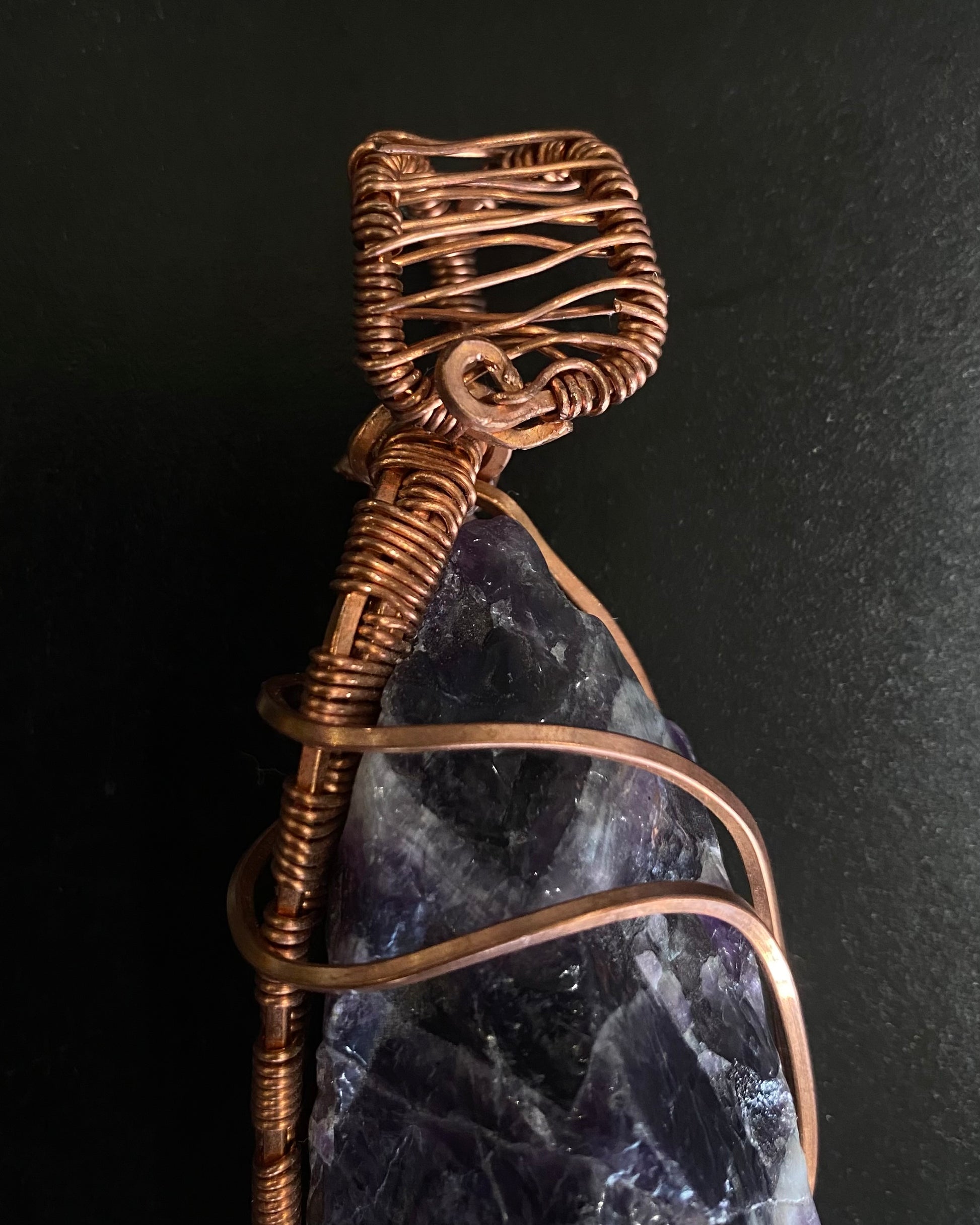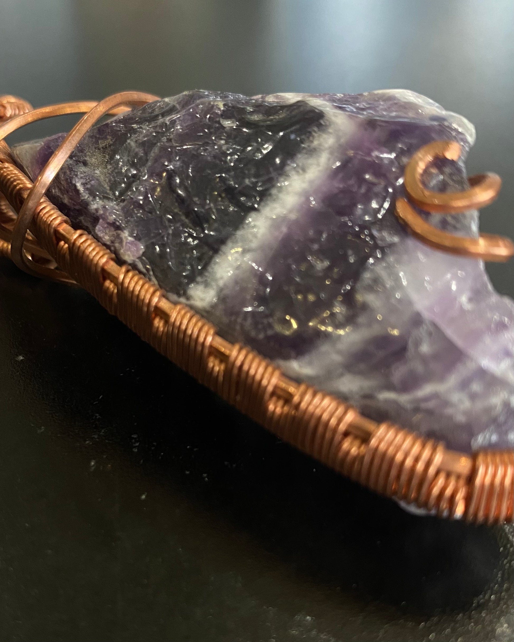 Break the ice in any room you walk into with this stunning piece of chevron amethyst wrapped in pure copper. The bail on this piece features intricate wraps while maintaining durability in its design.