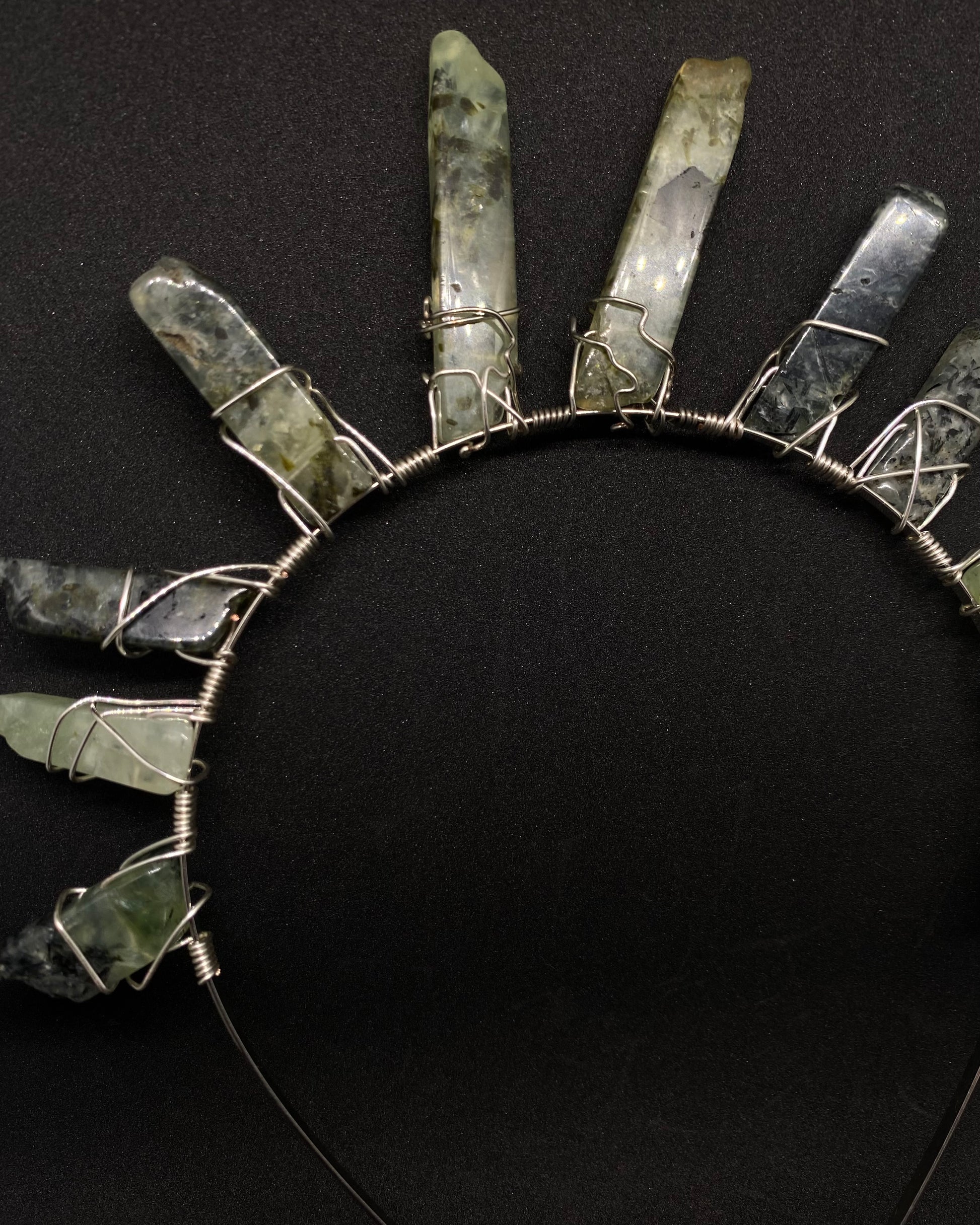 A style fit for any Goddess or Queen, durable & hand made crystal crowns. This piece features a sleek headband with slight bend & is adorned with Prehnite crystals.