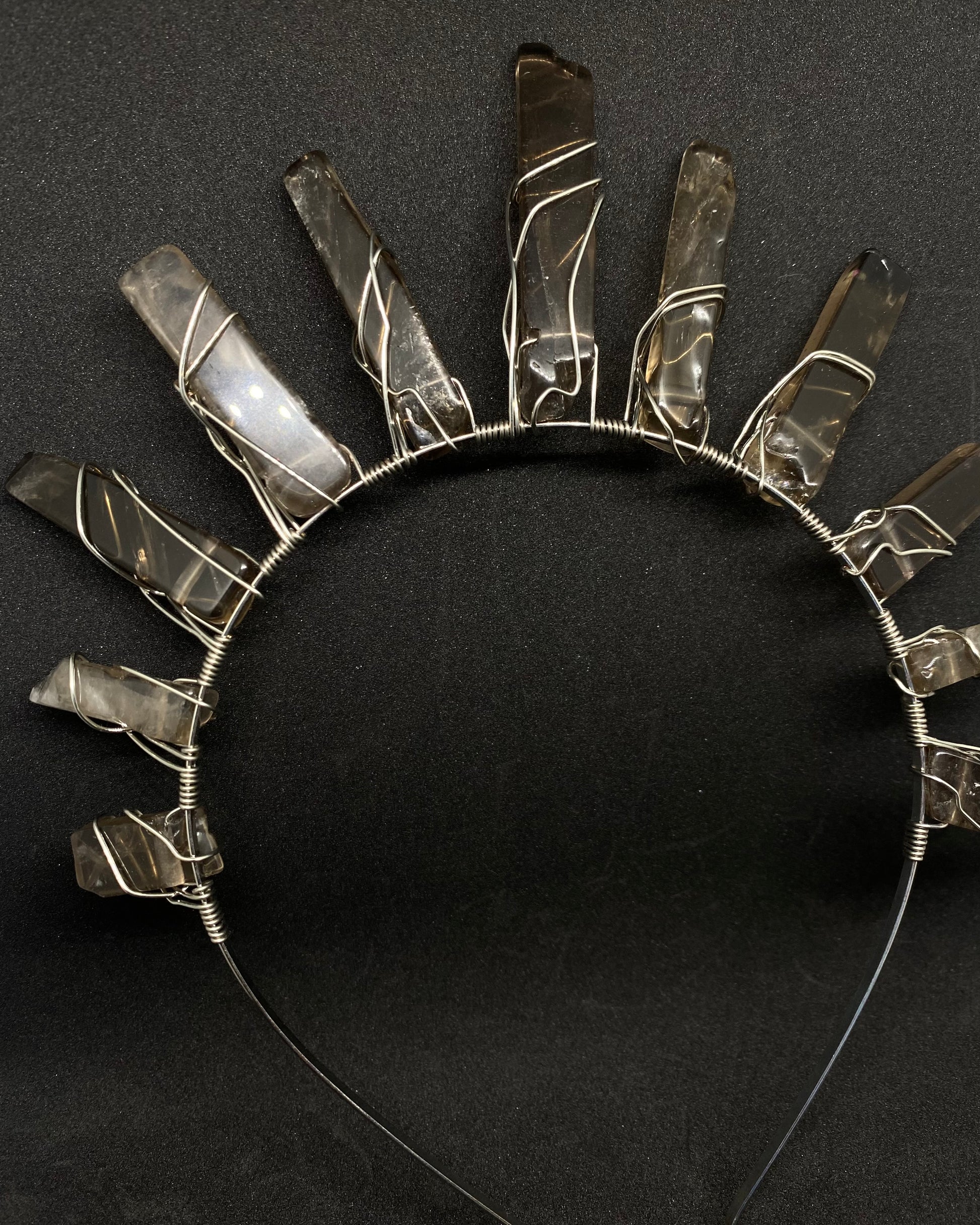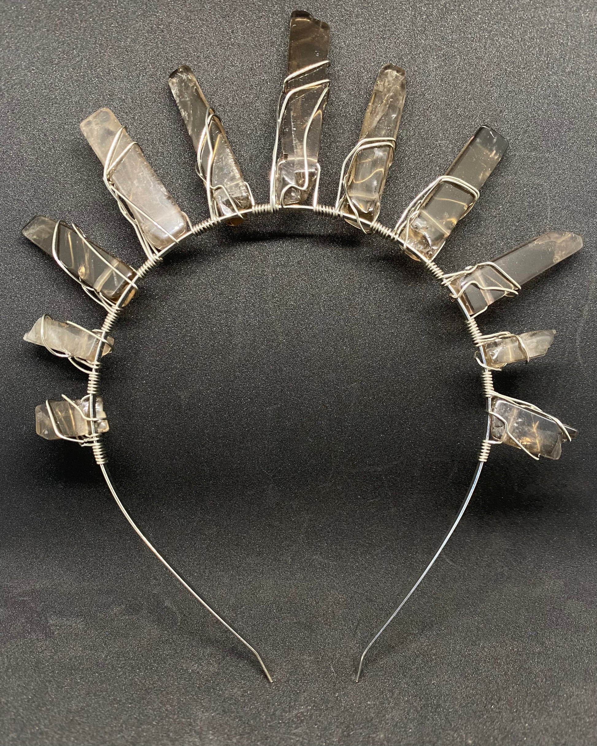 A style fit for any Goddess or Queen, durable & hand made crystal crowns. This piece features a sleek headband with slight bend & is adorned with Smokey Quartz crystals.
