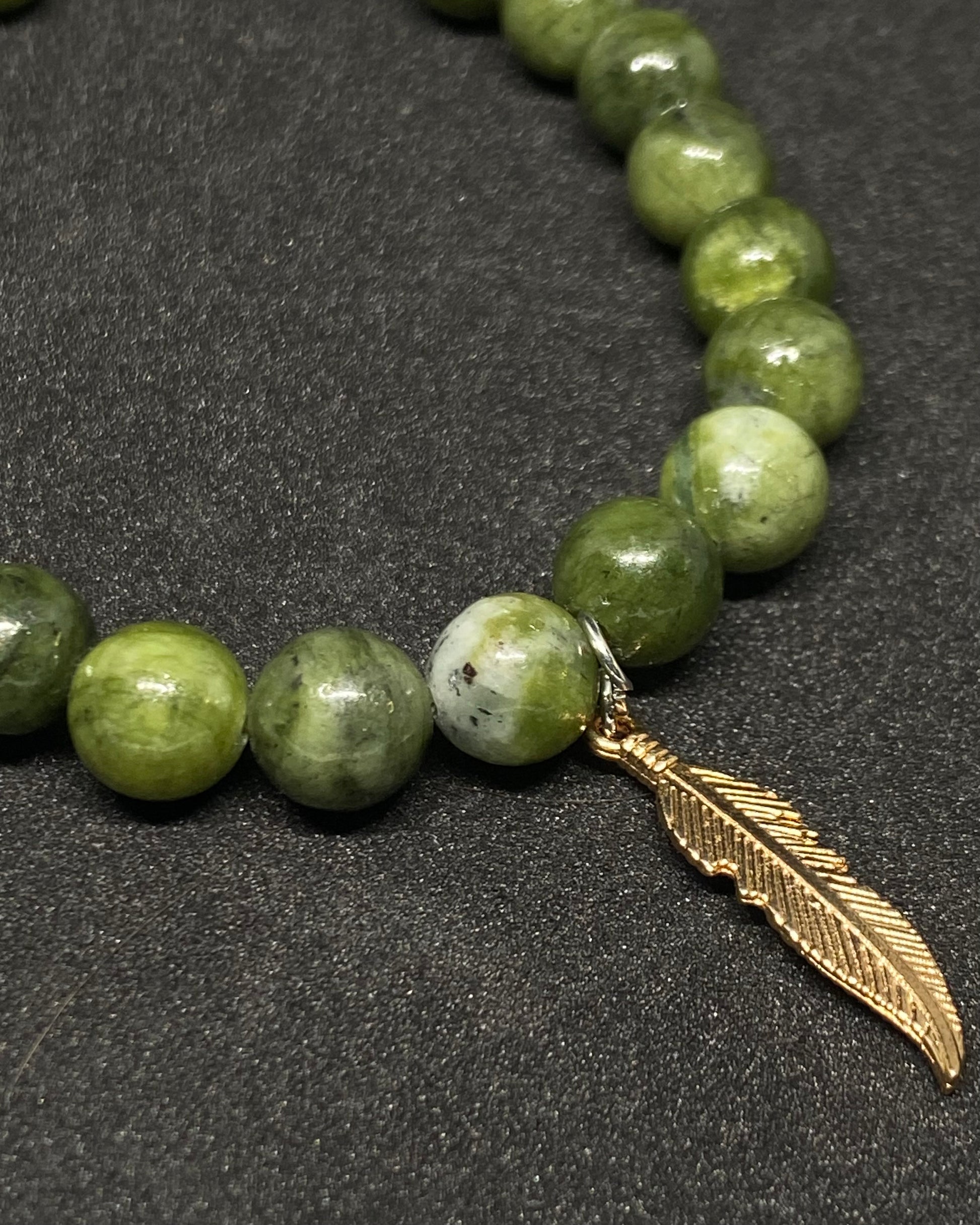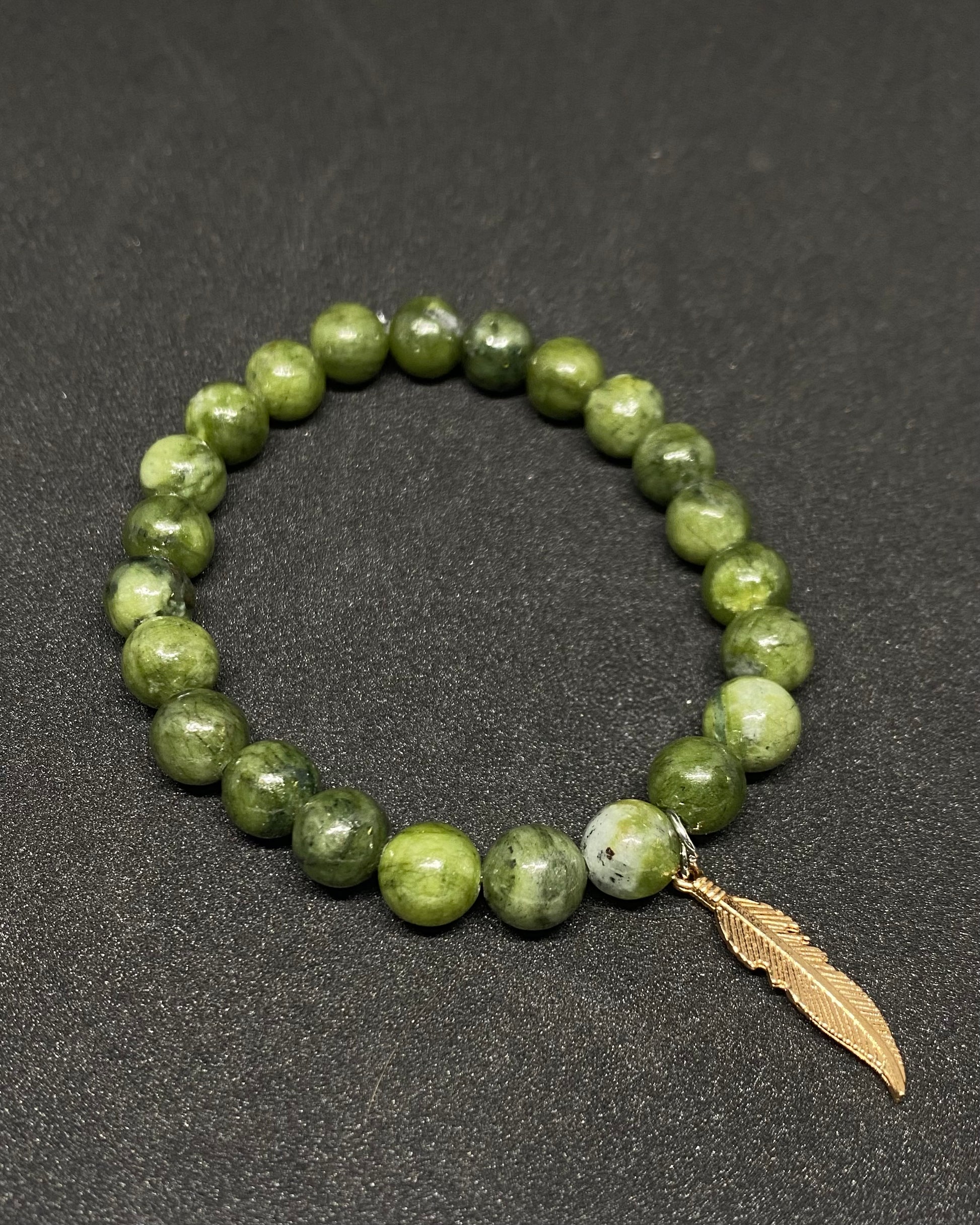 8mm natural gemstone Nephrite Jade beads, this bracelet also features a small gold feather charm.